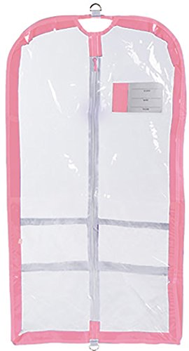 Details: Sturdy pliable PVC garment bag trimmed in your choice of pink or lavender. Size: 37" x 20"x 3" (Gusset). Three inch expandable gusset accomodates bulky costumes or multiple small hanging garments. Three outer ziper pockets (one large, two small) for shoes or accessory items.