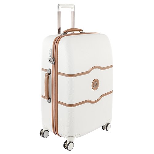Details: Arrive in style with this 24 inch Spinner suitcase. This elegant and innovative case is iconic of DELSEY Paris design and features faux leather accents for a classic look. Four double spinner wheels and a dual locking trolley handle allow for superior mobility. The interior is lined with a luxurious soft-touch lining with two zippered compartments, two removable bags and travel hanger. Delsey crafted this case with 100% Virgin Polycarbonate which is formulated to achieve the highest standards of extreme temperature and impact resistance.