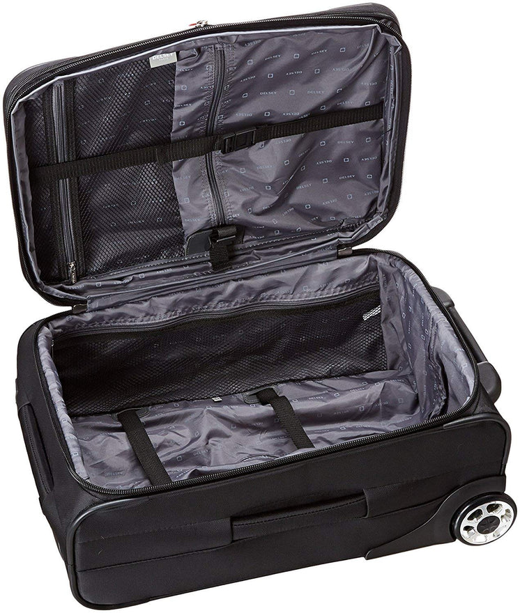 - Roomy main compartment expands 2 inches and is fully lined with adjustable tie down straps secure folded garments. Fold out suiter system in the lid help formal attire to remain wrinkle-free. Shoe pocket and zuppered pockets hold delicate items and accessories.