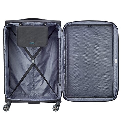 Details: Designed with a durable and lightweight design, this spinner luggage has all the features without all the weight. Featuring our Delsey dual-density, silent-core double spinner wheels, for smooth and eary maneuvering and a quiet ride. The exterior offers two front pockets for organization, an ergonomic trolley handle with soft-touch grip and rubber corner protectors to shield your case from normal wear and tear. This checked piece also includes the patented Delsey overweight indicator that indicates when your bag weighs over 48.5 lbs. This piece also includes a BONUS, removable tri-fold organizer with two zippered pockets and one zippered wet pouch. The interior also features a large mesh zippered pocket, a side pocket and tie-down straps so all of your belongings are secured and ready to travel.