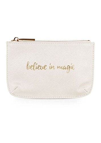 Details: "Believe In Magic' Richly textured leather pouch accented with gleaming prints Top zip closure Goldtone hardware Lined Includes dust bag 7.25"W x 5"H Leather Imported