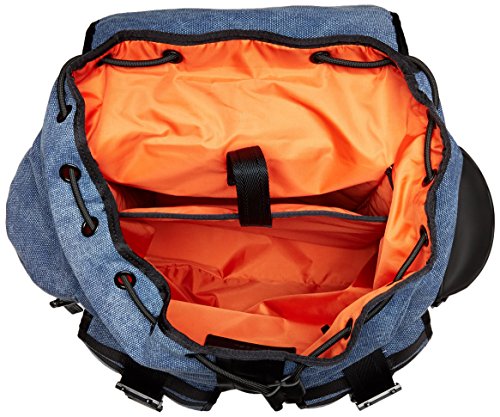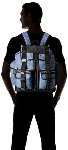 Details: Diesel medium-cage backpack in treated denim and leather with colorful detailing. Features padded and reinforced bottom for longer resistance, metallic hardware and branded rubberized zipper pulls and high tenacity nylon tape.