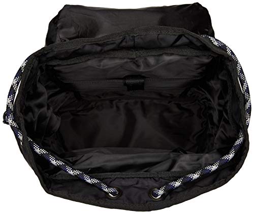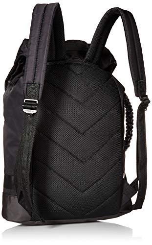 Details: This compact backpack has a sleek look and functional design. Crafted from nylon and detailed with coated tone-on-tone trims, the style is equipped with two external pockets and a padded section to hold your laptop or hi-tech devices. Rope drawstring closure with front flap, buckle closure. Additional side handle for multi-functional use.