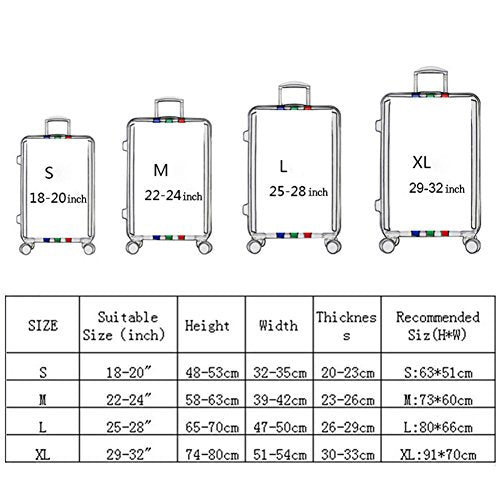 • Fit quickly and easily in seconds. Durable and washable, 4 sizes available to fit almost any luggage. S: fit 18-20 inch luggage, M: fit 22-24 inch luggage, L: fit 25-28 inch luggage, XL: fit 29-32 inch luggage.