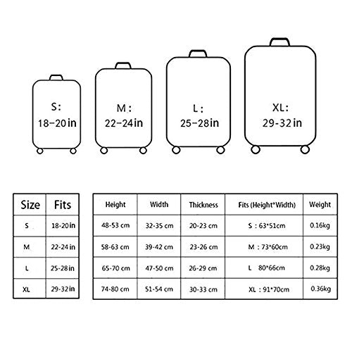 1.S (Suitable for 18--20 inch luggage) ,M (Suitable for 22--24 inch luggage), L (Suitable for 25--28 inch luggage), XL (Suitable for 29 - 32 inch luggage),If your luggage is hard shell style, please order a bigger size