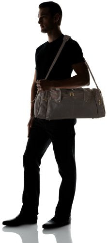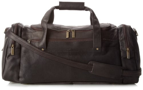 - Roomy leather duffel with antiqued metallic feet and hardware and clamshell zipper opening