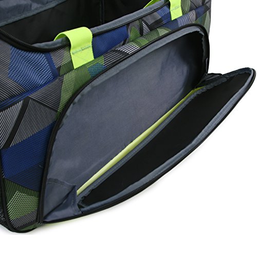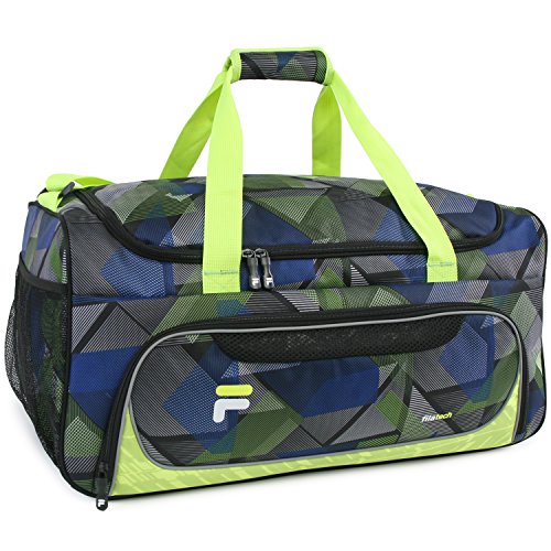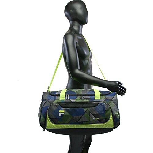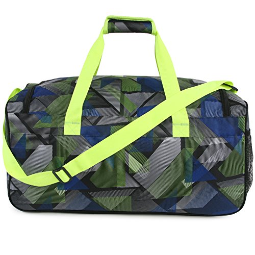 Details: Carry your gear to the gym or to training in this medium size design sport duffel bag. Compartments provide enough room for training clothes, shoes, water bottle, and other accessories. EXOVENT mesh ventilation pockets helps to keep your bag from smelling of foul odors. Includes a comfort carrying shoulder strap. 12" x 22" x 13"