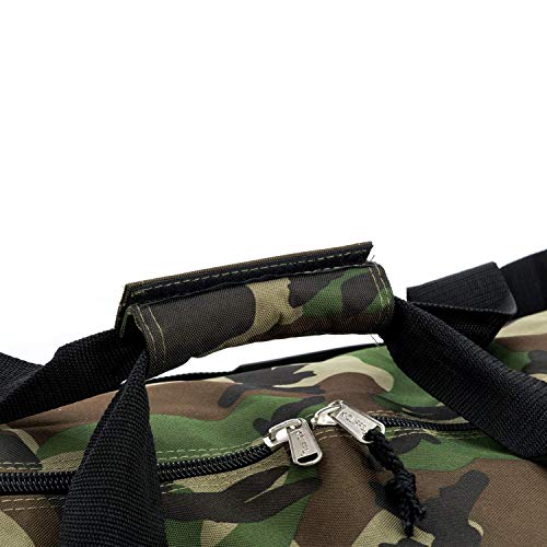 Details: Super Large heavy duty square duffel bag that is designed for travel and use as cargo bag, bike bag, gear bag, hockey bag and camping equipment hardware bag for all sports. Great ideal Car/SUV rooftop rack roofbag. Durable Quality Army / Military camo traveling luggage with Sturdy Main handles goes all the way to the bottom of the bag for extra support and durability. Material: High Density 600D Polyester. Huge Size Dimension: 42"x20"x20". Color: Camouflage. Front zipper pocket. XLarge #10 zipper on all pockets. Folds flat for easy storage NO wheels. Do NOT drag the bag on ground to avoid damage. For heavy load, team lifting is recommended using Self Fabric handle on both ends to avoid injury.