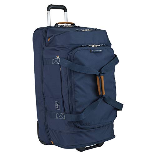 This easy-to-handle Whidbey rolling duffel is a reliable choice for medium-length tripswhether youre road tripping or checking it on your flight. Inside, two separate packing spaces (the bottom compartment is water-resistant for separating damp things) become one spacious area when you unzip and roll away the Skyway heritage-print divider.
