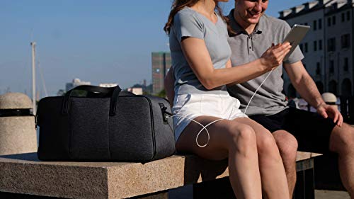 Details: ANTI-THEFT DESIGN - Retractable high strength metal coil and TSA approved combination lock. EXTERNAL USB CHARGING PORTS - Easily access your power bank with external USB and micro USB charging ports. FOLDS FLAT OR EXPANDS INTO FULL SIZE DUFFEL - When not in use folds into a compact 13" x 10" x 4" size for easy packing. Converts to a full-size duffel as needed. WATER RESISTANT POLYESTER EXTERIOR and burst proof zippers Full access panels for easy packing. Inner storage pockets for power bank, 10" tablet, and toiletries Zippered packing cube for clothing. Additional cube to hold items upright inside bag. Elastic straps secure clothing in place. Durable rubber carry handles.