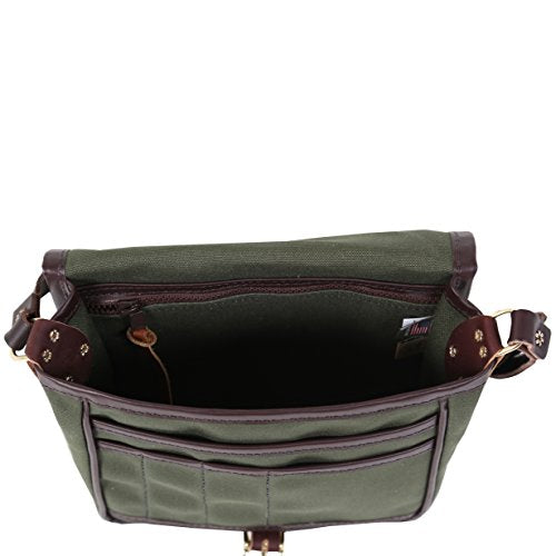 - Heavy-duty canvas construction, with leather trim and adjustable leather shoulder strap