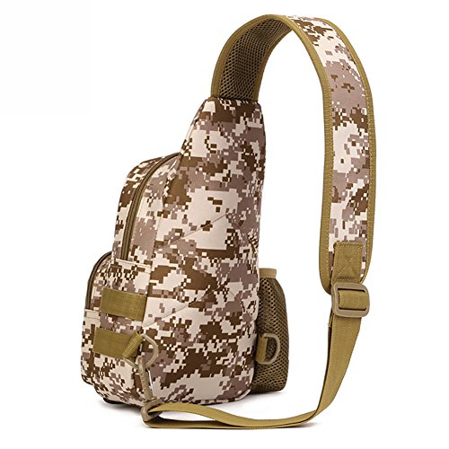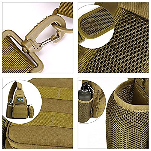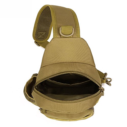Details: Department:Unisex Structure 1.Exterior: Three zipped front pocket,One side pocket 2.Interior: One open pocket 3.Outer Material: High strength abrasion nylon Inner Material: Waterproof Silky Cotton 4.Back: Thicken Breathable Sponge 5.Hardware: Metal+Lengthen the Rope Pull Head 6.Adjustable Long Shoulder Strap: Military Nylon Fabrics Nondetachable Shoulder Strap Measurements 1.Dimensions: 7"W x 9.8"H x 3.9"D Side Pockets: 5.5"H x 2.8"W 2.Shoulder Strap length: approx. 31"-42.5" Shoulder Strap Width: 2.8" Side bottle pocket diameter: approx. 2" 3.Weight: 0.88lb Features 1.Suitable for Trekking,Hiking Climbing,Campers and other outdoor activities. 2.Chest sliding adjustment system can quickly adjust to their comfortable state,so that more comfortable Backpack. 3.MOLLE external expansion system designed to be used in combination with other equipment,you can load pockets,water bottle bag,accessory kits and other. 4.The bag works well with a variety of different outfits and casual styles. Notes 1.Care:Hand wash with cold water. 2.Tolerance:0.39"-0.79" 3.Packing List:Tactical bag x 1.