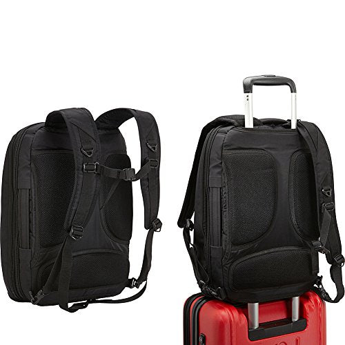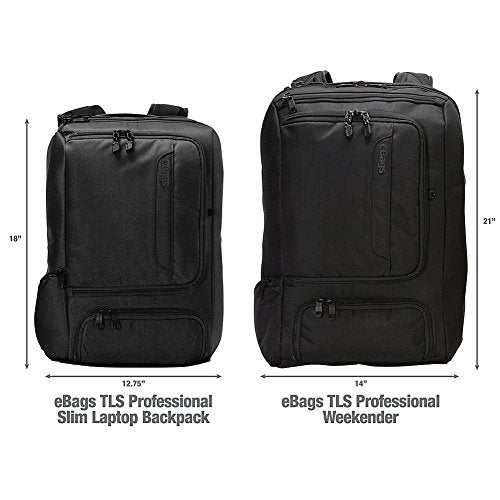 Head off to work or school with your laptop and other must-haves packed safely and stylishly inside this slim backpack. The eBags Professional Slim Laptop Backpack is made from twisted poly fabric and features a streamlined shape and a sophisticated design that converts from a backpack to a briefcase. Detailed with a vented Airmesh back panel and contoured backpack straps for incredible comfort, this bag features fully padded and lockable laptop and tablet compartments, a crush-proof pocket for your AC adapter, and a zippered water bottle pocket. The middle compartment includes a diagonal slash pocket to hold loose papers and folders, while a front organizer includes a key leash, business card pockets, mesh pockets, pen loops, and pockets to hold all sorts of small accessories.
