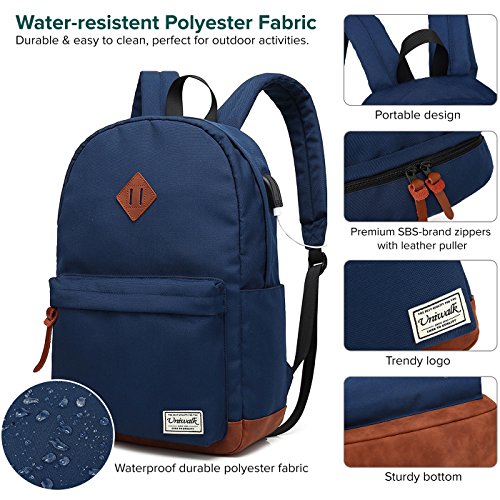 Details: Uniwalk multifunctional backpack Perfect for daily life. You can take it to school, college, traveling, hiking, weekend getaway. Waterproof durable backpack ○ Made of premium quality polyester which is an ideal material, lightweight and ultra-strong at the same time. Durable to use and easy to clean. ○ Waterproof materials protect your belongings from the rain. Perfect for outdoor activities. ○ Reinforced bottom and high detailing ensure the base of backpack durably covered. ○ SBS brand Zippers are premium quality, solid and study. zippers featuring with leather puller makes sliding much easier. Comfort on the go ○ Dual padded, reinforced and adjustable shoulder straps and fully padded back panels make it comfortable to wear even when loaded with all your gear. ○ External usb charging port with built-in cable makes charging electronic devices conveniently. ○ With the earphone adapter, listen to music on the go. Roomy backpack ○ Features multiple storage compartments, keep your accessories well organized. ○ No need to bring an additional bag when traveling with your computer. The padded interior features a separate space for 14-inch laptop. ○ Several interior pockets to hold iPad, power bank, cellphone, pens and other accessories. 2 side pockets for umbrella and water bottle. Anti-theft design ○ A hidden compartment on the backside provides a safe space for your cellphone. About Uniwalk Uniwalk was founded in 2004, ever since then, Uniwalk has been driven by the notion of developing and offering innovative, functional and durable backpacks for a variety of wonderful experiences in life. We never stop exploring, always be curious and looking for smart new solutions and technologies to improve materials and designs.