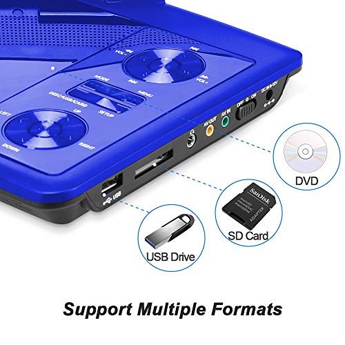 - ❤ Broad Compatibility with Multimedia: This portable video player supports direct play various discs( of all regions) from CD, DVD, CD-R/RW, DVD -R/+R, DVD+RW/-RW, VCD to SVCD (but not blue-ray DVD). USB and SD cards ( max to 32G ) are supported for playing MP3/WMA/WAV, JPEG, MPEG2/AVI/DIVX.