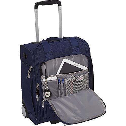 Details: Keep your essentials in sight at all times with this versatile underseat carry-on from eBags. The eBags Kalya Underseat Carry-on 2.0 with USB Port is made from durable nylon and poly fabrics and features a chic, contemporary design with multiple pockets for storage and a USB port that makes it easy to charge your devices when you're on the go. Sized to fit beneath most airline seats, this carry-on includes a key leash, a zippered mesh pocket, two pen pockets, and a padded pocket to hold your cell phone. A front zipper pocket offers storage for a magazine or a light jacket, while an elasticized water bottle pocket on the side makes it easy to stay hydrated when you're on the go.