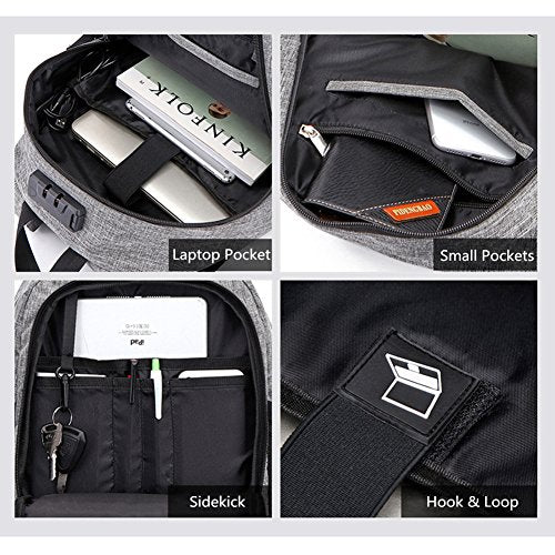 - Humanized Smart Details - 1. USB & Headphone port,2 ports allows charging and listening to music when outside;2. Reflective stripe on front and shoulder stripes keep you safe in dark place;3. Back bottom strap can attach with trunk,easy for business men;4. Code lock anti-thief for the main pocket ensure property security;5. Glasses hanger and card pocket in shoulder strap makes it easier for life;6. USB cable attached with good organization