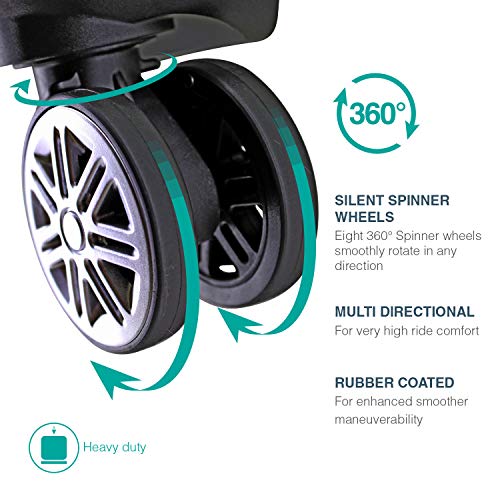 - 2 YEAR WARRANTY - 8 spinner wheels make this bag easy and effective to move around even in tough terrain. Wheels have a 360° spin function that allows you too manuver your bag around with ease, so there's less pain on your shoulders / GARANTÍA DE 2 AÑOS: 8 Ruedas Giratorias Hacen Que Esta Bolsa Sea Fácil Y Efectiva Para Moverse Incluso En Terrenos Difíciles. Las Ruedas Tienen Una Función De Giro De 360 ° Que Te Permite Maniobrar Tu Bolsa Con Facilidad