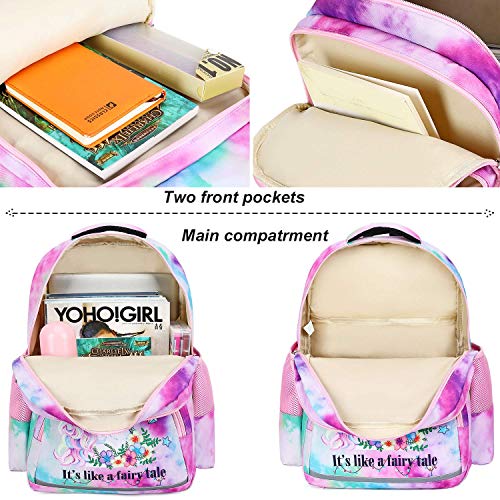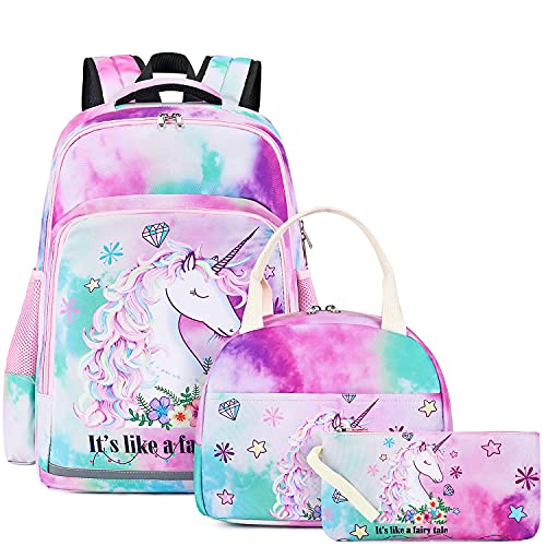 - Quantity: 3 pieces, Including Girls unicorn backpack + Insulated Lunch tote bag + pencil pouch, All bag are printed a fairy unicorn, large capacity, multiple pockets, fits 14"laptop/ Mac and accessories, 3" binder/folders, school textbooks and supplies, etc.