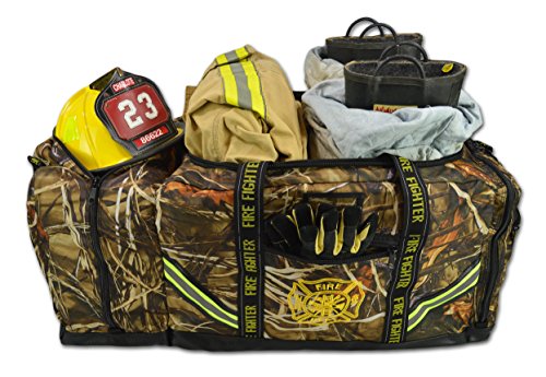 Details: A variation of the original LXFB10 from Lightning X, we've made a camo version after suggestions from hundreds of volunteer firefighters in the field. The LXFB10DC is made to match the look and durability of your hunting gear by using a deep woods camo nylon weave with the proven design of the LXFB10. Lightning X Products has been improving the design of this bag for nearly 20 years. Through voice of the customer feedback the LXFB10 has been designed from the inside out by firemen like you. It's large enough to hold all of your turnout gear, helmet, SCBA mask, jumpsuit and other items all while being rugged enough to withstand the abuse that firemen are known to inflict on their gear. It's large, it's rugged, it's reflective all-over and it looks good! Everyone else in the firehouse will be asking where you got it. Here are some more features, including: Currently the largest fire gear bag on the market - Made of heavy-duty water resistant nylon with a PVC backing - Yellow/silver triple trim reflective striping with leather binding reinforcement - Extra large dual zippers for long lasting durability - Helmet compartment zipper runs full width of bag - Strong padded shoulder strap will hold all of your gear - Water resistant wrap-around reinforced bottom and sides protects from abrasion + water leakage and extends under helmet compartment - Large enough to hold 2 sets of turnout gear - Extra compartments for helmet, jumpsuit, scba mask, and gloves - All logos are embroidered, not screen printed like similar bags - 3M Reflective stitching and "Fire Fighter" weave in shoulder strap and all webbing straps - Dimensions: 34"(L) x 18"(W) x 16"(H) - Includes a limited lifetime warranty from Lightning X Products, Inc.
