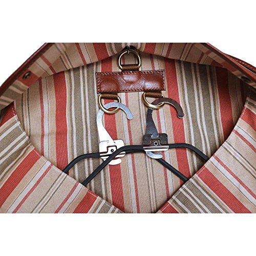 Details: Floto Collection Garment Suit Bag is crafted from full grain vegetable tanned Italian calfskin leather, brass zipper and hardware, smooth wax finish edge paint, and canvas lining. The calfskin leather for this bag was vegetable tanned in Tuscany to create rich color tones while the semi gloss finish helps prevent stains. Over time this leather bag will soften and develop a beautiful patina. Our 8 oz cotton duck canvas lining is made in South Carolina and very durable. The combination of Italian vegetable tanned leather, Italian craftsmanship, and U.S. made canvas lining make our leather travel bags high quality, rugged, and lightweight. The FC Suit Bag unfolds to 56" to carry long garments. Generous zip compartments and pockets hold shoes, shirts, and accessories. Two suit hangers are included. Recommended for up to 2 garments. Made in Italy.