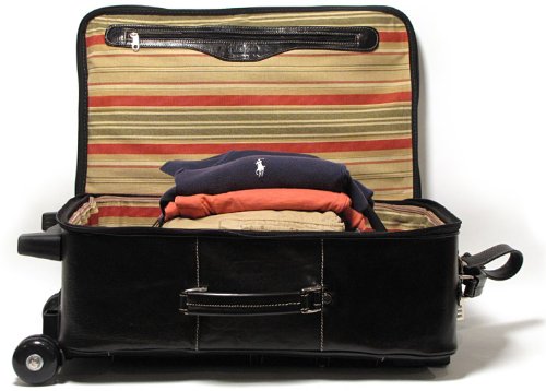 Details: Handmade in Florence using Floto Italian Calf-Skin leather, the Venezia Trolley is available in Vecchio Brown, Olive Brown, Tuscan Red, Orange and Black. Features: Main Body - 14" h x 7 " w x 21" l Gusset Zip Compartment - 11.5" h x 1.5 " w x 16 " l Italian Polished Calf-Skin Leather Double Stitched Seams Three Outsize Zip Pockets Large Inside Zip Pocket Multi-Purpose Strap and Combo Lock Floto Stripe Canvas Interior Stainless Steel or Brass Hardware 100% Cotton/Denim Lining Weight - 6.5 pounds
