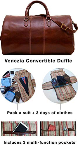 Details: The Venezia Garment Duffle Bag unzips on all sides to pack a suit + your clothing. Very easy to pack for a business trip or wedding weekend. Pack your clothes, then zip it up into a classic duffle bag style. The inside has 3 multi-function zip pockets for tech and accessory storage - one 8" x 14" pocket and two 7" x 7" pockets. When you arrive at your destination you can unzip, unpack your clothes, and hang your bag with the suit in it by the handle. Garment Duffle Bag - this bag unzips on all sides to pack a suit + your clothing. Very easy to pack for a business trip or wedding weekend - it zips up into a classic duffle bag style. IMPORTANT - customers have complained about the zipper being hard to use - please see the packing instructions image #3 for proper zipping method!