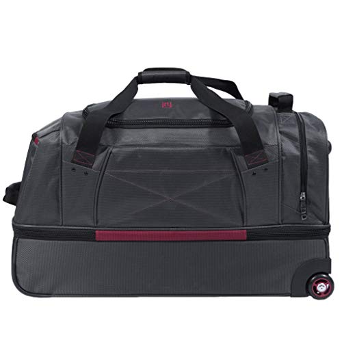 Details: The Tour Manager rolling duffle bag combines the ample storage space of your standard duffle bag with the ease of transport of your standard rolling luggage suitcase. It offers a spacious, split level storage compartment that can ether divide in half, with a zipper pass through, or function as a large single storage space. This rolling duffel easily rolls through airports on corner mounted wheels, and the telescoping grip handle makes transport a snap. The duffel bag also features additional storage in front and rear zipper compartments, A water resistant bottom ensures that your items will stay moisture free during travel.Features: Made from 1680 Denier ballistic nylon that is lightweight but durable and offers resistance to punctures, tears, and abrasions Unlike other duffels, it is mobile on corner-mount wheels for smooth and easy wheeling through airports A retractable pull handle is durable, easy to grip, and makes transport a breeze Split-level storage lets you organize your essentials with ease, or you can have one large storage compartment with the pass-through zipper panel The upper half of the bag has high storage volume and a large top opening, making the duffel ideal for longer trips. Front and rear zipper compartments and a Logo panel zipper compartment lets you have quick convenient access to smaller items Water resistant bottom ensures that your items will not get wet during transport Front and rear grab handles make for quick and easy loading into overhead storage bins or trunks