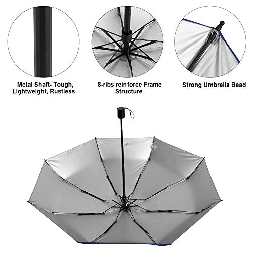 - 【UV Peotection Umbrella】Canopy is made of 270T Pongee with silver-coated inner layer,this sun&rain umbrella provides UV and water blocking,blocking 95% UV ray and protects you well from the heating sun and any expected downpours. Keep you cool in the sun and safe in the rain.The waterproof coating make it dry quickly and you could just put it back into bag in short time after use