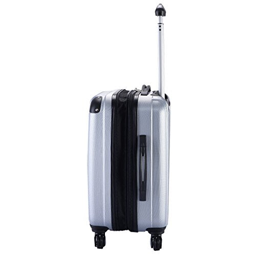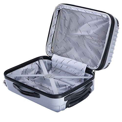 Details: This 20" trolley suitcase is constructed from lightweight ABS material and features an embossed scratch-resistance shell, a heavy duty handle and 4-wheel spinner for effortless moving. Inside the suitcase, there is elastic tie straps to minimize shifting your contents and a zipper divider to create two separate interior compartments.