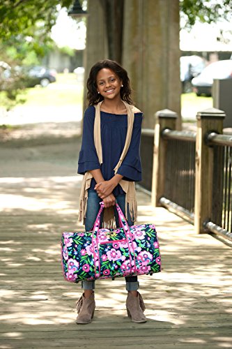 Details: Printed Polyester*** Duffle Bag with Zipper Closure*** Outside and inside zipper pockets*** 21" L x 10" W x 11"H*** Reinforced bottom with rubber feet.*** Adjustable/removable shoulder strap*** Embroidered area is approximately 5" wide by 2" tall