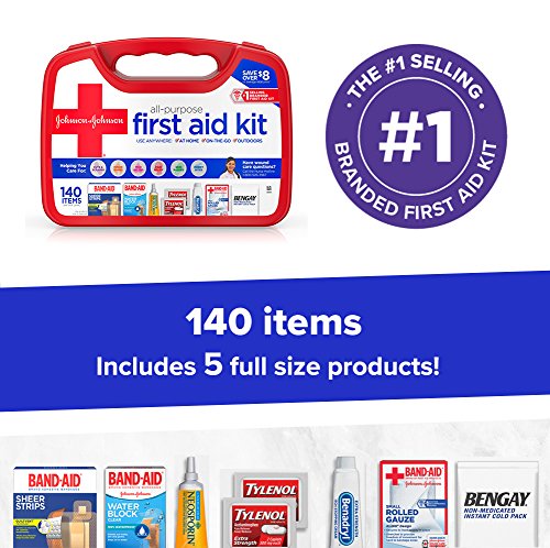 Details: Care for minor cuts, scrapes and burns with the Johnson & Johnson All Purpose Compact First Aid Kit. This portable emergency kit contains 140 essential first aid supplies, including cleansing wipes, gauze pads, assorted bandages, rolled gauze, antibiotic cream, itch stopping cream, acetaminophen caplets, an instant cold pack, and more. This first aid kit contains products from leading, doctor-recommended brands, including Band-Aid Brand Adhesive Bandages, Neosporin, Tylenol and Bengay. It includes two pairs of gloves, a first aid guide and a durable, plastic box to keep items accessible and organized. This #1 selling branded first aid kit* is for use anywhere – at home, in the car and on-the-go – and offers a great value by saving you over $8 vs. average retail price.*Claim based on Nielsen, for the 52WK period ending 06/09/18 total US.  2018, The Nielsen Company.