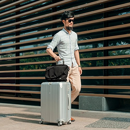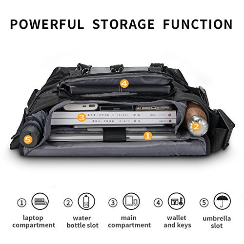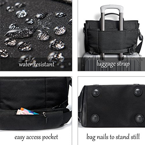 - Design: This shoulder bag for men and women besides all the essential functions other messenger bags have, we added unique details for our customers: luggage strap on the back for you to carry around with your luggage; two compartments for water bottle and umbrella on each side; Side pocket like fanny bag for easy access of often used things; on the back of the messenger bag, there are 4 foot nails to make the bag stand still.