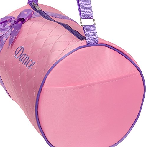 Details: This Dance Duffle Bag from Silver Lilly is the perfect travel companion for you or your daughter. Made from durable nylon, this duffel bag can be quickly cleaned with a damp cloth and won't easily tear or puncture. Easily store her dance shoes, outfit, accessories, and more in the large circular main compartment. An interior zip pocket is the perfect size for your cell phone, keys, or wallet. For additional storage and convenience utilize the exterior mesh pocket, slip pocket, and adjustable carrying strap. Make this your girls favorite bag for the gym, softball, soccer, basketball, dance, or cheer. Measures 12.5" x 9" x 9".