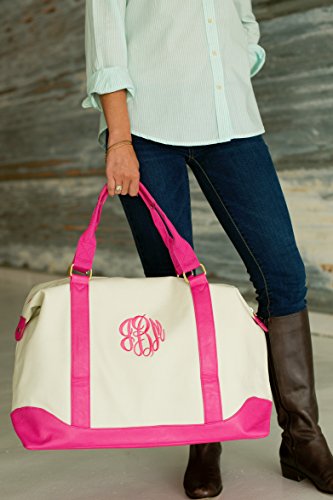 Details: You really couldn't ask for anymore in this perfect weekend bag! The larger dimensions (20"L x 10.5"W x 16.5"H) are great for a night away or packed full for a long weekend. Double handles and thick straps create added comfort when carrying this little duffel around. A zipper closure keeps your items more secure and prevents everything from spilling out of your bag if it gets tossed and jostled around. The reinforced bottom keeps this adorable tote durable trip after trip. It is a quality traveling tool that can easily double as a gym or beach bag and then used on a picnic. This polyester weekender with stylish leather-like trim creates a fun pattern without a lot of extra adornments. It's a perfect fit for a business trip or a fashionable but professional look for around the office. Adding some personalization to this bag makes a special added touch or leave it blank, keeping it perfect as-is. The Weekender makes a thoughtful gift from everyone to the college student to the bride-to-be. If the 1" Tiny Block Monogram is selected then it will appear 3.5" below the top zipper.