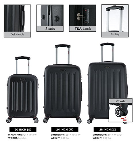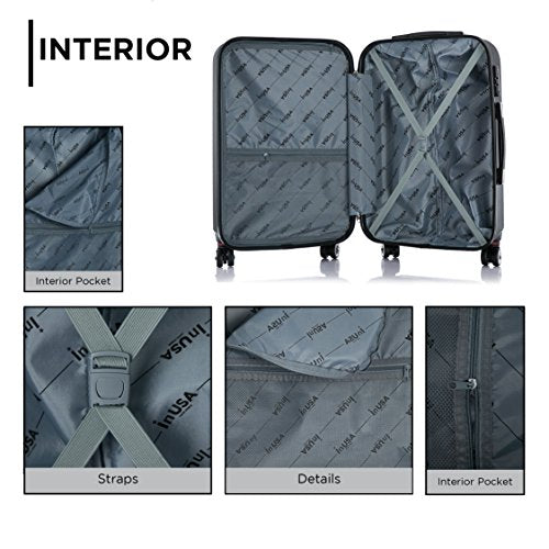 Details: The InUSA Philadelphia collection is proudly assembled in the USA from imported parts using lightweight ABS/PC engineered material with micro diamond finish. Functional style with 4 airplane design dual spinner multi-directional silent 360 degree wheels for effortless mobility. The sturdy construction offers maximum strength, durability and a water/scratch resistant finish. Full interior fabric lining with a zippered compartment on one side, opposite side offers elastic tie-down straps for additional support and an inside pocket. A side mounted 3 digit TSA approved combination lock, push button locking internal retractable trolley system. The small size offers a Top ergonomic GEL handle. The medium and large size offers Top and Side ergonomic GEL handles for comfortable and easy lifting. Smooth running quality oversized number 10 Zipper. Four side studs allows each piece to stand upright on its side. The expandable feature allows for an additional 25% extra space offered in the Large size piece. This product can be purchased in different colors