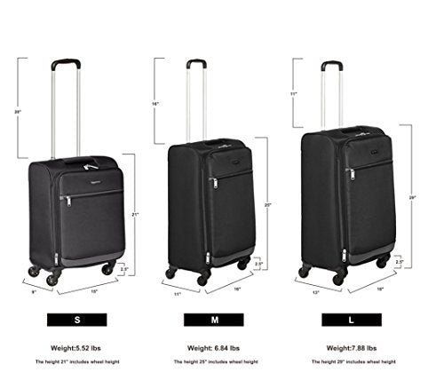 - 21 inches high (including the wheel) softside spinner luggage for weekend getaways or as international carry-on