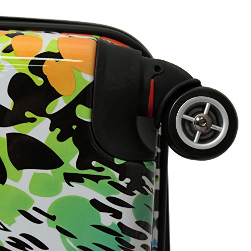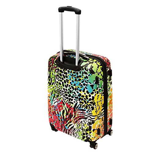 - Dual polycarbonate/abs shell, imprinted 210 denier chariot nylon lining, tie-down straps, double spinner wheels, push button telescopic handle, top and side carrying handle