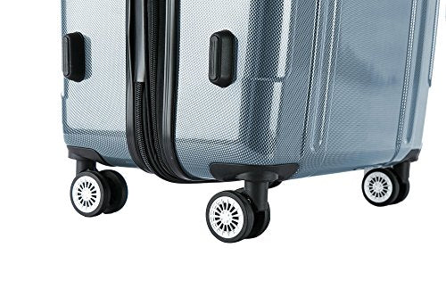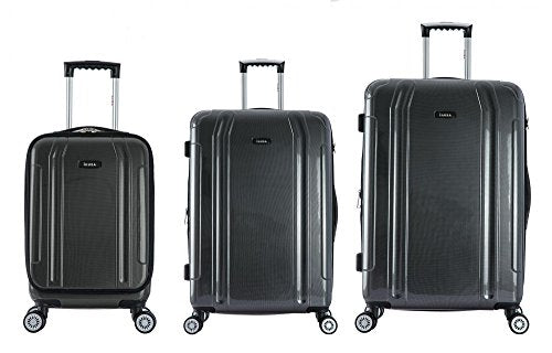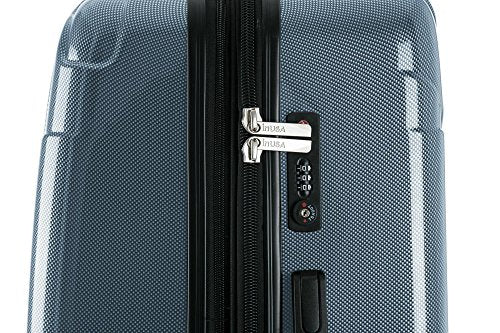 Details: The InUSA SouthWorld collection is proudly assembled in the USA from imported parts using lightweight ABS and PC printed Film engineered material with brushed metallic or carbon finish. The sturdy construction offers maximum strength, durability and a water/scratch resistant finish. Functional style with 4 airplane design dual spinner multi-directional silent 360 degree wheels for effortless mobility. Full interior fabric lining with a zippered compartment on one side, opposite side offers tie-down straps for additional support and two inside pockets. Built-in 3 digit TSA approved combination lock, push button locking internal retractable aluminum trolley system. The carry-on includes a convenient easy-access front pocket with integrated padded sleeve which can accommodate a 15? laptop , store your passport and other travel accessories. The small size offers a Top ergonomic GEL handle. The medium and large size offers Top and Side ergonomic GEL handles for comfortable and easy lifting. Smooth gliding oversized number 10 tamper proof Zipper. Four side studs allows the Medium and Large size luggage to stand upright on its side and they expand 2 inches for additional extra space. This product can be purchased in different colors.