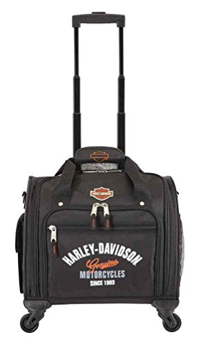 Details: When the urge hits you to just grab a change of clothes for the weekend and get on the next flight, pack all your essentials in the Harley-Davidson plane case with spinner wheels and zip right through the airport. Constructed of 1200 D polyester. Features four multi-directional spinner wheels. Fits under most commercial airline seats or in the overhead. Has a hidden telescoping handle. Full front and top zippered opening for easy access. Front pocket organizer.