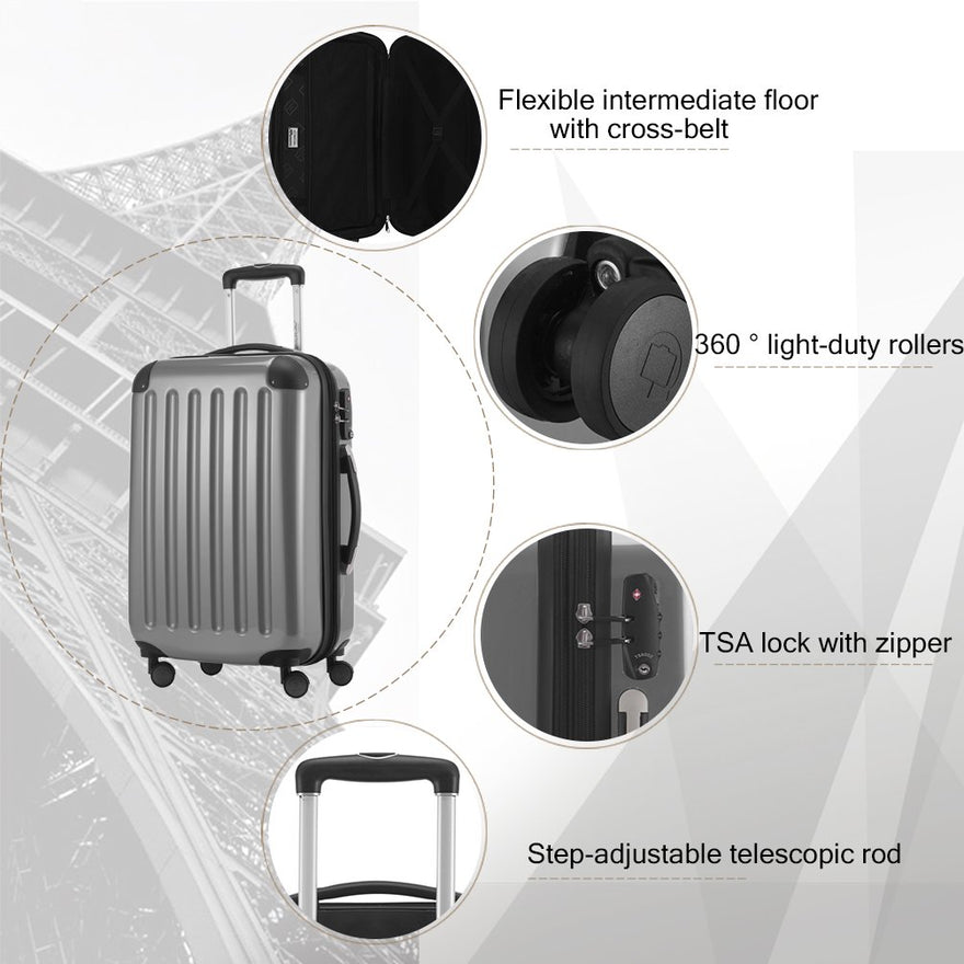 - Three different size: 1 cabin luggage 42 liter (21.5 x 13.5 x 7.5 + 1.5 inches) + 1 suitcase 74 liter (25.6 x 16.1 x 10.2 + 1.5 inches) + 1 suitcase 119 liter (29.5 x 19.7 x 11.8 + 1.5 inches)