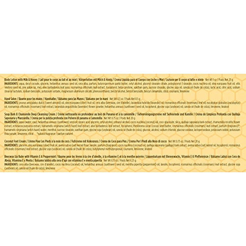 - SKIN CARE PRODUCTS: Pamper from head to toe with this giftable set including 5 travel size Burt's Bees favorites: Soap Bark and Chamomile Deep Cleansing Cream, Hand Salve, Milk & Honey Body Lotion, Coconut Foot Cream and Beeswax Lip Balm