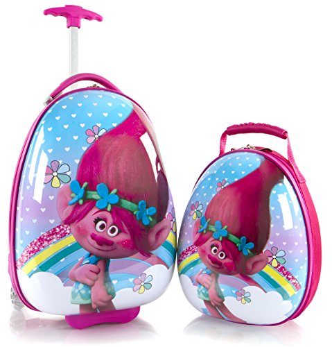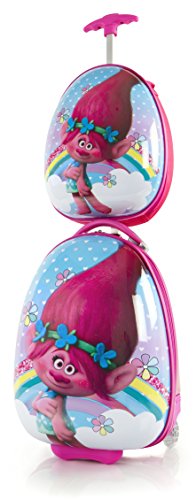 Details: Designed especially for kids. The ''Designer Trolls' collection was created by Heys with the unique characteristics of children in mind, as it incorporates several design features that benefit children. My Trolls Luggage and Backpack 2PC set are sure to turn heads with their fun and colourful designs. These beautiful cases have Trolls characters specially printed onto their hardshell surfaces. In creating a 'High-end' series for Trolls our designers incorporated several children-specific features. One of these is the internal 'reversed-curved' handle system that curves the handle inwards & upwards closer to the child, making it much more comfortable for the child - at a low height - to hold and navigate the case. The Patent Protected design of this case also allows the wheels to 'protrude' out. This protrusion keeps the case elevated, so that even when being rolled at a very low height off the floor, the wheels will be the only point of contact and the case will continue to roll with ease. The cases weigh in at a mere 3.2 lbs and the Backpack at 1.0 lbs. The Luggage feature our inline skate wheels that make their rolling even smoother, so any child can easily wheel these fun cases around. They also have a zipper closure system, that when opened reveals a beautifully lined interior as well as a zippered divider for internal organization.
