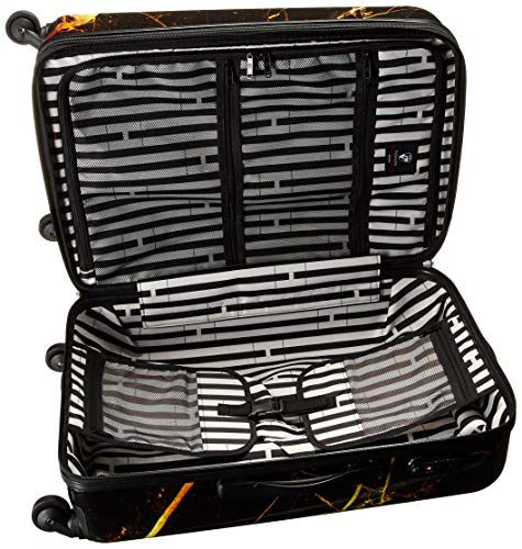 - Top and side carry handles made from lightweight aluminum. Zip expansion system gives you an extra 20% packing capacity. Mounted TSA lock for your security during travel. Fully lined interior with a stylish patterned fabric. Interior features a zip compartment and an open compartment with a compression panel. Four interior zip mesh pockets for the ultimate packing and organization experience. Four 360° spinner wheels to effortlessly maneuver you through the airport. This case features the H