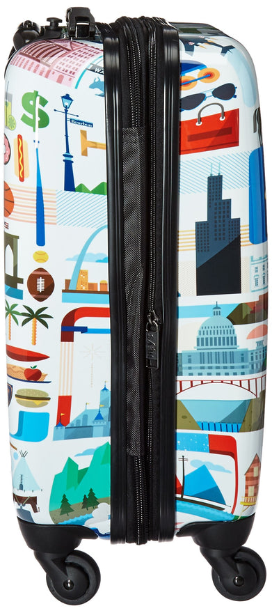 Details: The FVT - USA Spinners are part of a Limited Edition Series of luggage created by renowned digital artist Fernando Volken Togni. Fernando is a Brazilian-born illustrator who currently lives and works in London. His intricate compositions and bold use of colour are influenced by the observation of details and daily life. Through vivid colours and sharp shapes Fernando forms an eye catching organized chaos. Inspired by icons and landmarks unique to the United States, the FVT - USA Spinners adds a flair of American pride to your luggage and will not go unnoticed. Take America with you wherever you go, the artwork has been uniquely designed to represent and celebrate the United States as a nation. The vibrant luggage prints are protected by a layer of clear coat which also gives it a beautiful glossy shine. As with all Heys luggage, the FVT - USA Spinners are incredibly lightweight, and feel even lighter when you roll them on their ultra-smooth 360 degree spinner wheels. This four wheel spinner system spreads the weight evenly allowing for effortless rolling in different terrains. The cases have a zippered opening system as well as a zipper released expansion system which creates up to 20% more packing space. All 3 pieces also come with built-in TSA locks. When opened, the FVT - USA Spinners reveal their inner beauty with a fully lined interior and built-in divider with mesh pocket. Available in a 3 pc set.