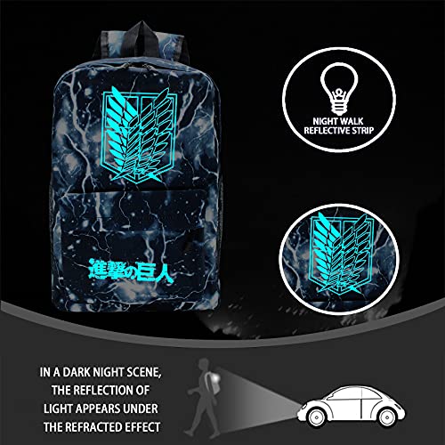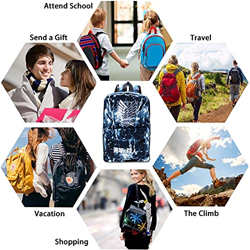 Details: Anime Attack on Titan Backpack Survey Corps Wings of Freedom Printed College Bag Laptop School Bag A gift for your friends and yourself. Product Data Backpack Size: 11.8 * 4.7 * 16.5 inches Keychain Size: 1.4 * 1 inches Brooch Size: 1.4 * 1 inches Package: Backpack*1, Keychain*1, Brooch*1Reason For Choosing Us Material100% high 1uality polyester. It is very durable and can protect books, electronic products, clothing, etc. DesignThe backpack has good breathability, ergonomic design of shoulder strap and scientific reasonable weight-bearing design. Effectively relieve shoulder pressure. All these designs can leave you a more comfortable experience. Protect LaptopMain compartment with a laptop sleeve fits laptop, keep your laptop safe with strap and shockproof foam padding. Glowing In DarkThe best thing about this bag is that after absorbing light during the day for about 10-20 minutes, you can see the fluorescent effect in the dark.Notes: 1-2cm error of measuring is a reasonable range due to different measurment methods. The actual colour of the backpack maybe different from the picture shown due to the different screen of display or reflecting light when shooting.