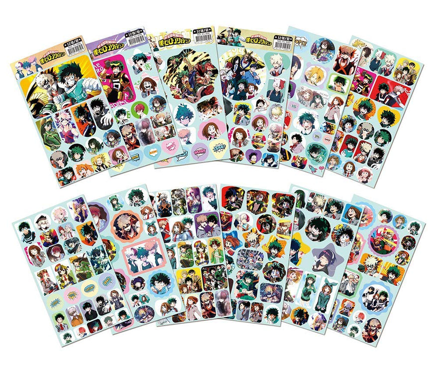 - 12 sheets of No-repeat my hero academia stickers, each sheet of size is 8.5*6.5 inches, the sticker is nice decoration for your laptop/luggage/skateboard etc.; 4pcs MHA button pins can be used on your bag/t-shirt/jacket/guitar strap and anywhere else you would like, 2.36 inches in diameter.