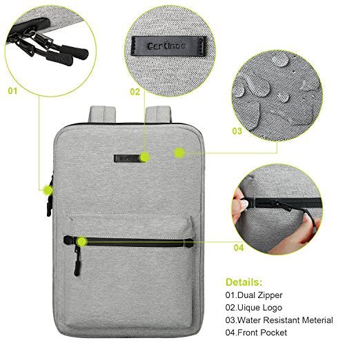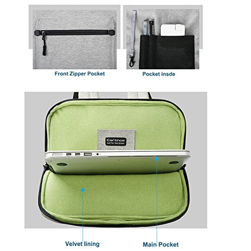 Extra pocket in front, enough space to keeping document, charge, mouse cable, cellphone, memory cards, external hard drive, pens etc. Top-loading zipper on the sleeve glides smoothly and allows convenient access to your laptop.