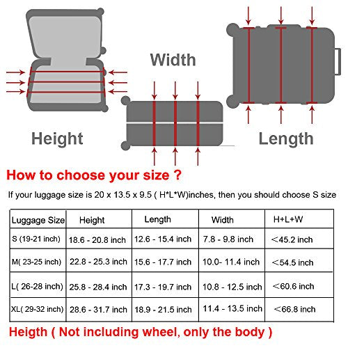 - Durable and washable,Fit quickly and easily in seconds. 4 sizes available to fit almost any luggage. S: fit 18-21 inch luggage, M: fit 22-25 inch luggage, L: fit 26-28 inch luggage, XL: fit 29-32 inch luggage.