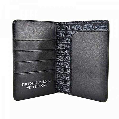Details: This Star Wars passport holder is the perfect safe place for a passport whilst travelling. Featuring a Darth Vader badge icon with debossed detailing, it has room for a passport, 4 cards and another slip pocket for tickets, documentation or bank notes. 'The Force is Strong With This One' is printed on the inside in silver metallic lettering and the lining features a repeated Star Wars logo design.- Officially licensed travel pass holder- Protects your passports, credit cards, bus or train tickets, etc.- Material: PU Leather/Nylon- Size: 11 x 15 x 1 cm